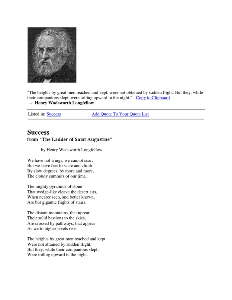 Success poem by henry wadsworth longfellow. Henry Wadsworth Longfellow was one of the most widely known and best-loved American poets of the 19th century. Here you will find a collection of famous poems of Henry Wadsworth Longfellow. Possibly his 2 most famous poems are Paul Reveres Ride and The Song of Hiawatha.